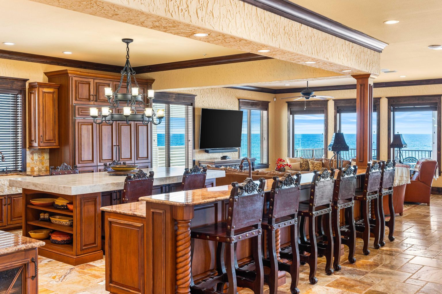 The chef’s kitchen is as functional as it is beautiful—complete with a Venus leathered marble island, granite countertops, and top-tier appliances from Viking, Sub-Zero, Scottsman, and Perlick. An oversized breakfast bar invites morning gatherings, while the adjacent Gulf front balcony is perfect for sunset cocktails or private beach strolls via your dedicated walkover.