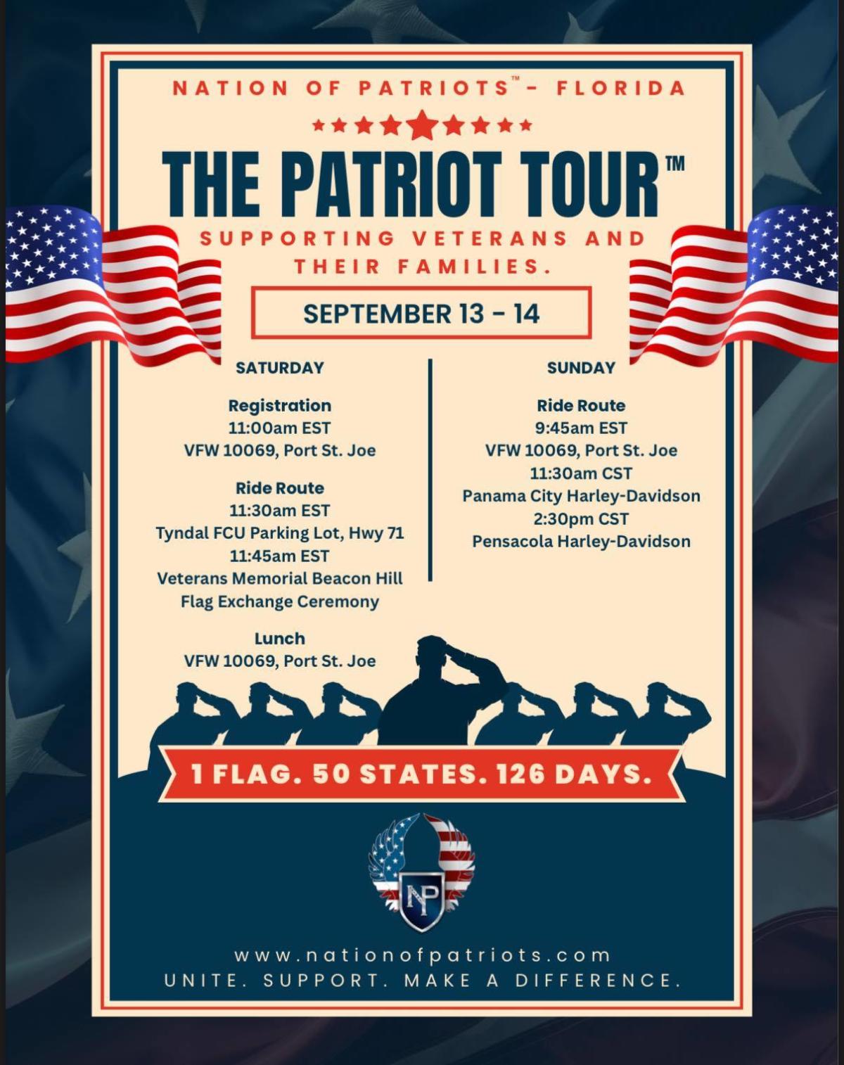 For the first time in the 16 year history of Nation of Patriots we are bringing The Patriot Tour to the Florida Panhandle. Please join us on Saturday Sept.13 for the flag transfer ceremony from Tallahassee riders to riders in the Florida Panhandle, followed by food and festivities at the John C Gainous VFW Post 10069 – The Friendliest Post on the Coast Everyone is welcome.